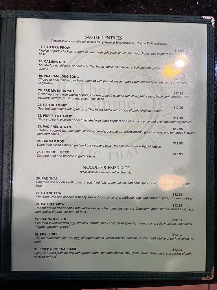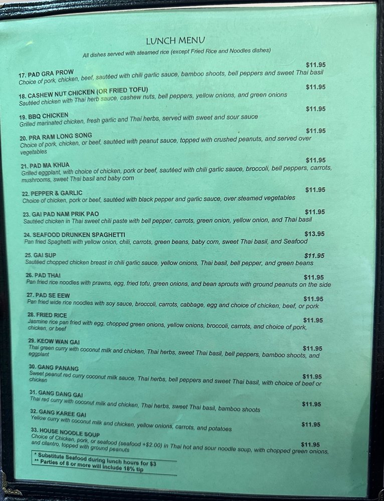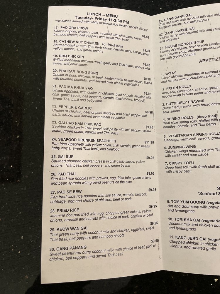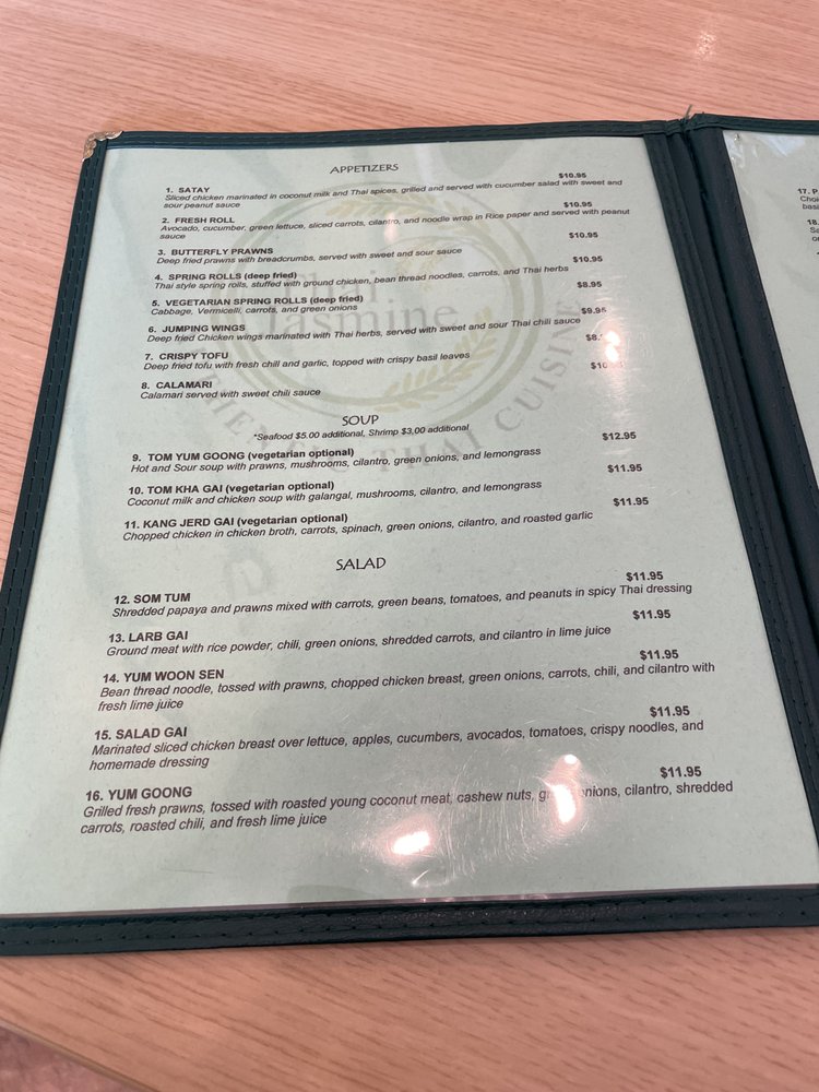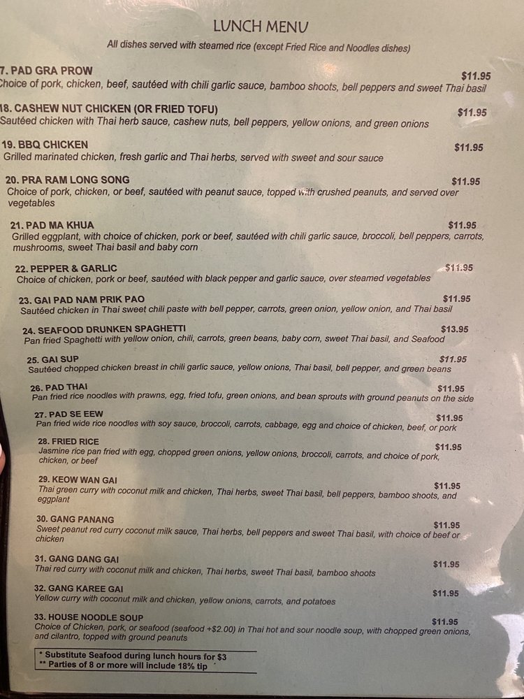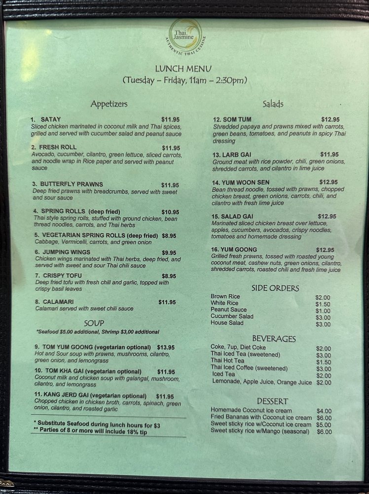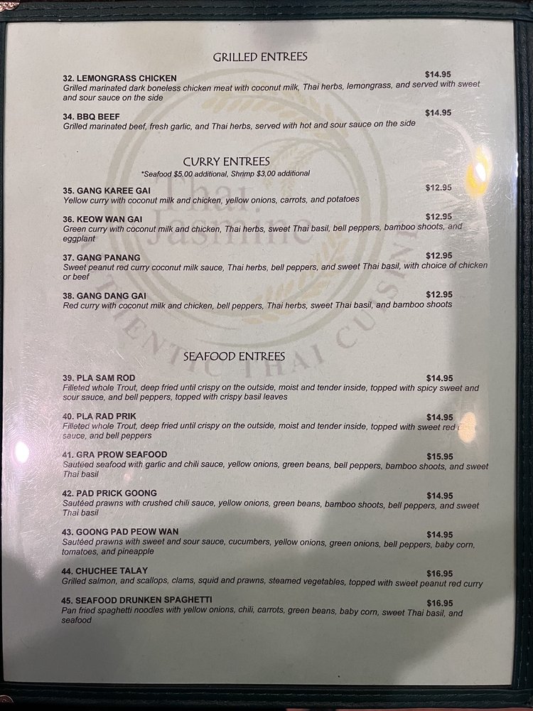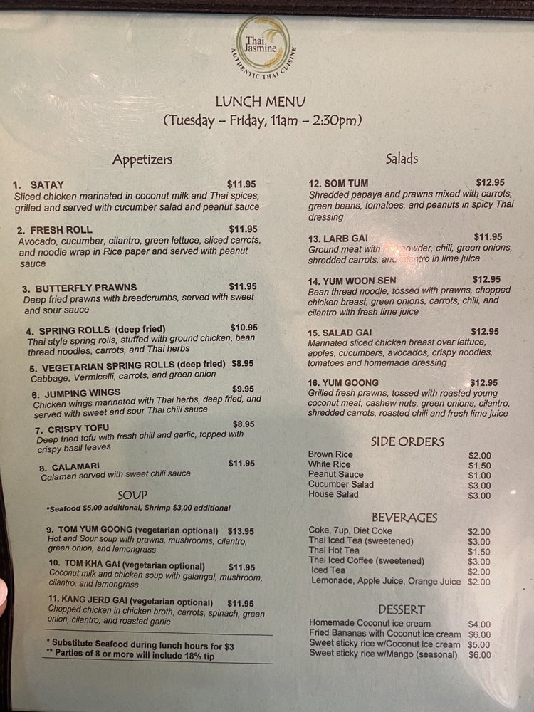Introducing the menu at Thai Jasmine is a delightful experience for any food enthusiast. Located in Tracy, CA, this restaurant offers a variety of Thai cuisine with options for vegans and vegetarians. The extensive menu includes favorites like panang curry, salad gai, Pad Thai, and Tom Yum Goong, all bursting with flavor. Customers rave about the delicious food and great service, making it a go-to spot for locals and out-of-town guests alike. The cozy ambiance and attentive staff create a welcoming atmosphere for diners to enjoy their meal. With options for takeout, delivery, and reservations, Thai Jasmine caters to a wide range of preferences, ensuring a memorable dining experience for all. Explore the menu, savor the flavors, and immerse yourself in the world of Thai cuisine at Thai Jasmine.